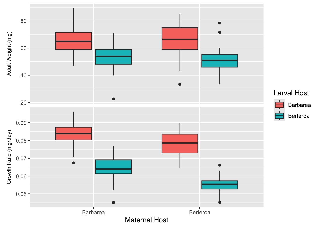 write.csv(data_summary, here("Output", "data_summary.csv"))# Create custom labels for the plot facetsresponse.labs <-c("Growth Rate (mg/day)", "Adult Weight (mg)")names(response.labs) <-c("GrowthRate", "AdultWeight")# Plot and savedata_p %>%ggplot(aes(x =factor(MaternalHost, level =c("Barbarea", "Berteroa")), y = Value,fill = LarvalHost )) +geom_boxplot() +labs(x ="Maternal Host", y =NULL, fill ="Larval Host") +facet_wrap(facets =vars(Response), nrow =2,strip.position ="left", # Move facet labels left to act as y-axis labelsscales ="free_y", labeller =labeller(Response = response.labs) ) +theme(strip.background =element_blank(), # Clear background behind facet labelsstrip.placement ="outside"# Place labels outside of axis ticks )
